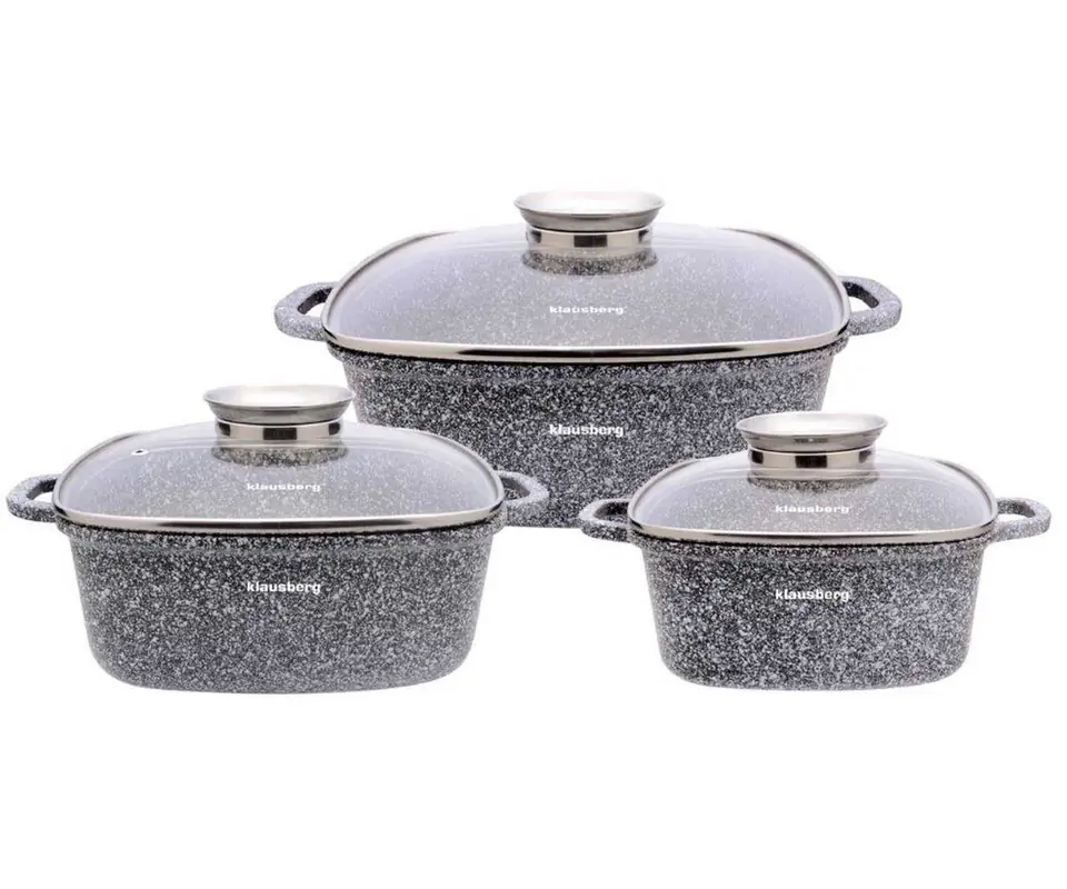 Zestaw odlewanych z aluminium garnków z ceramiczną, żaroodporną powłoką marmurkową, umożliwiającą zdrowe gotowanie.