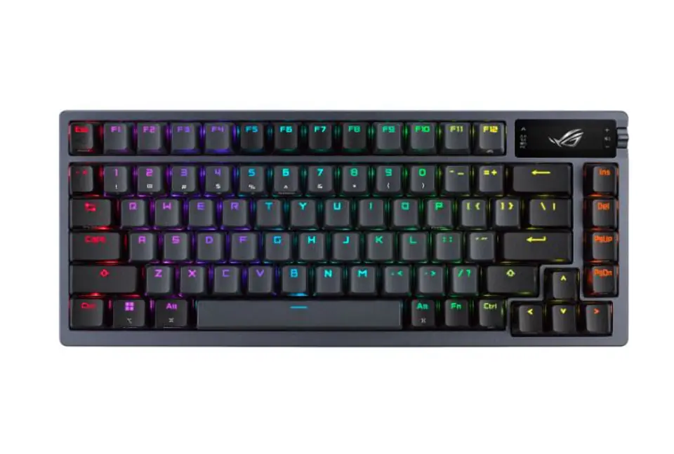 Niestandardowa klawiatura do gier ROG Azoth o współczynniku kształtu 75, mocowaniu na uszczelkę, trójwarstwowej piance tłumiącej i metalowej górnej pokrywie, wysoce konfigurowalna dzięki wstępnie nasmarowanym przełącznikom mechanicznym ROG NX z możliwością wymiany podczas pracy, stabilizatorom klawiatury ROG, podwójnym nasadkom klawiszy z PBT i zestawowi smarowania, trzy -tryb połączenia z technologią 2,4 GHz SpeedNova, wyświetlaczem OLED, trójkierunkowym pokrętłem sterującym, trzema kątami nachylenia i obsługą komputerów Mac