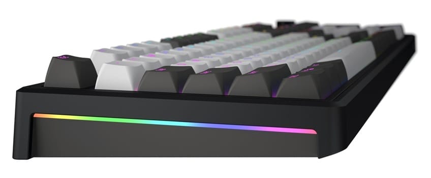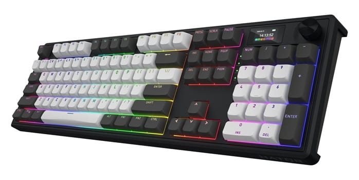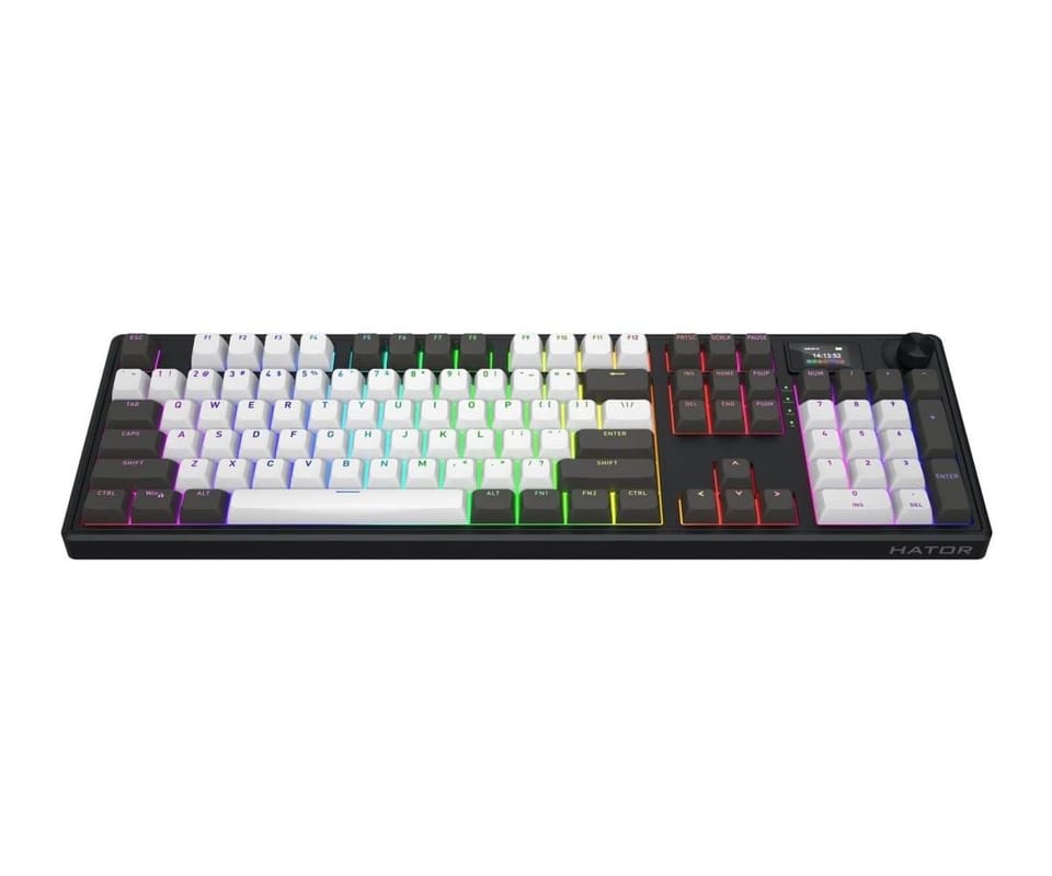 Hator Skyfall 100 PRO Wireless została wyposażona w innowacyjny, 1,14-calowy ekran TFT, który umożliwia wyświetlanie informacji o funkcjach klawiszy, stanach urządzenia, a nawet własnych animacji, co otwiera nowe możliwości personalizacji. Dedykowane oprogramowanie pozwala na indywidualne programowanie podświetlenia RGB dla każdego klawisza z paletą 16,8 miliona kolorów oraz niezależną konfigurację 19 stref podświetlenia na bocznych panelach. Praktyczne pokrętło multimedialne umożliwia szybką regulację głośności i przypisanie dodatkowych funkcji, a technologia Hot-Swap wraz z dołączonym narzędziem ułatwia wymianę przełączników bez lutowania. Wytrzymałe keycapy Double-Shot PBT o profilu OMA są odporne na ścieranie i blaknięcie, zachowując estetyczny wygląd przez długie lata intensywnego użytkowania, co czyni tę klawiaturę inwestycją na lata.