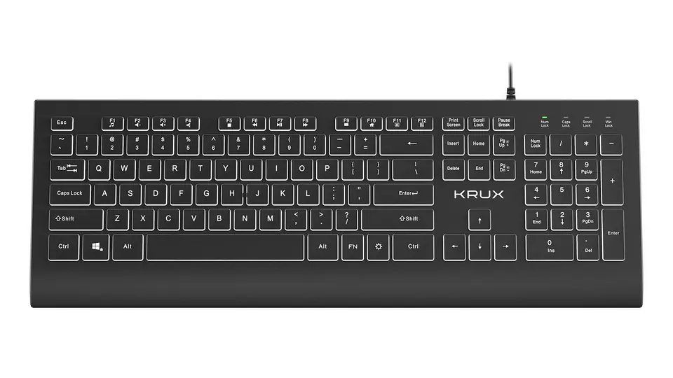 Pod każdym klawiszem klawiatury KRUX Ergo Line znajduje się punkt świetlny w kolorze białym. Natężenie podświetlenia można regulować w kilku poziomach, bądź wyłączyć w razie potrzeby. Docenią to osoby które czasem muszą spojrzeć na klawiaturę, ale nie chcą aby oświetlenie było aktywne non-stop.