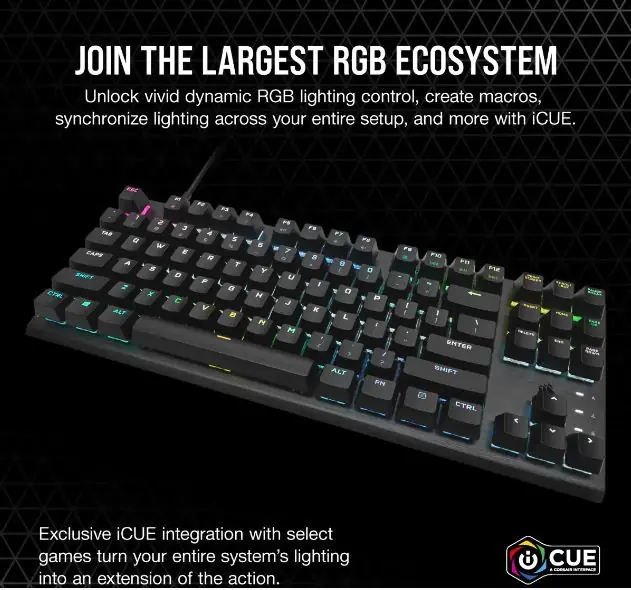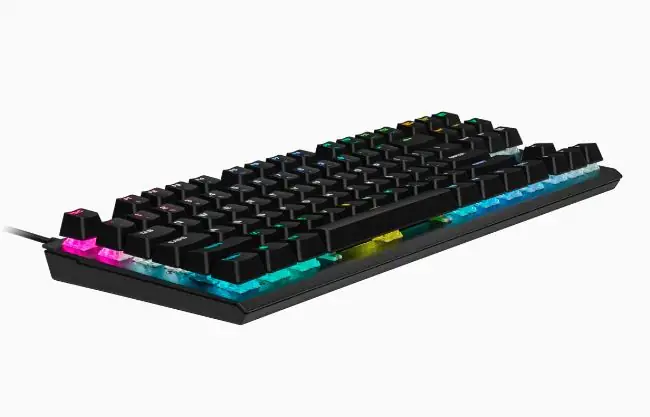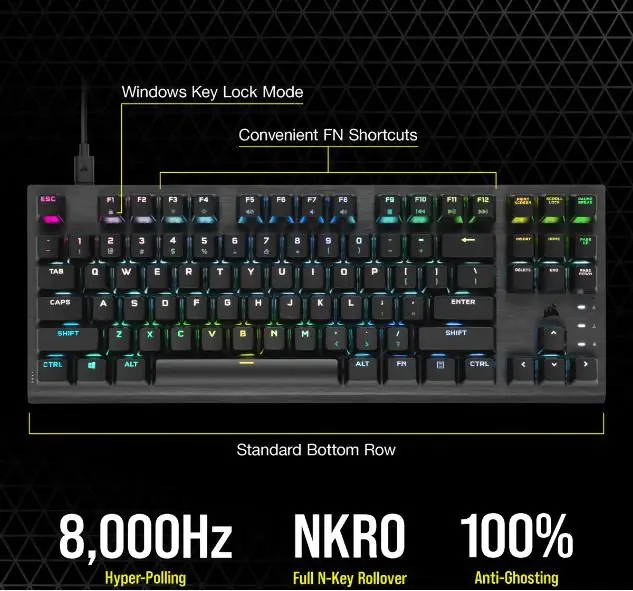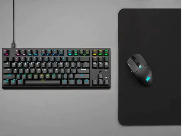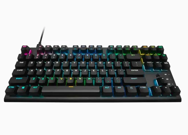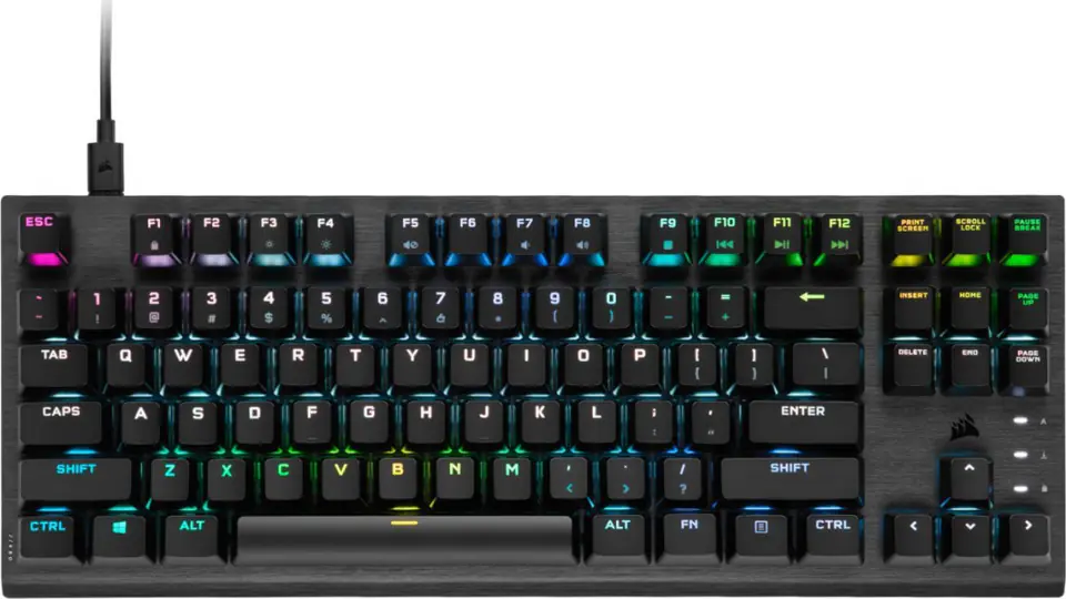Optyczno-mechaniczna klawiatura do gier CORSAIR K60 PRO TKL RGB bez klawiszy Tenkey zapewnia kompaktową stylistykę i wysoką wydajność dzięki optyczno-mechanicznym przełącznikom klawiszy CORSAIR OPX i wytrzymałej ramie ze szczotkowanego aluminium.