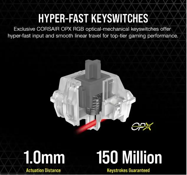 Wyjątkowe optyczno-mechaniczne przełączniki klawiszowe CORSAIR OPX oferują niezwykle szybkie wprowadzanie danych z odległością aktywacji wynoszącą zaledwie 1,0 mm i płynnym ruchem liniowym, co zapewnia najwyższą wydajność w grach.