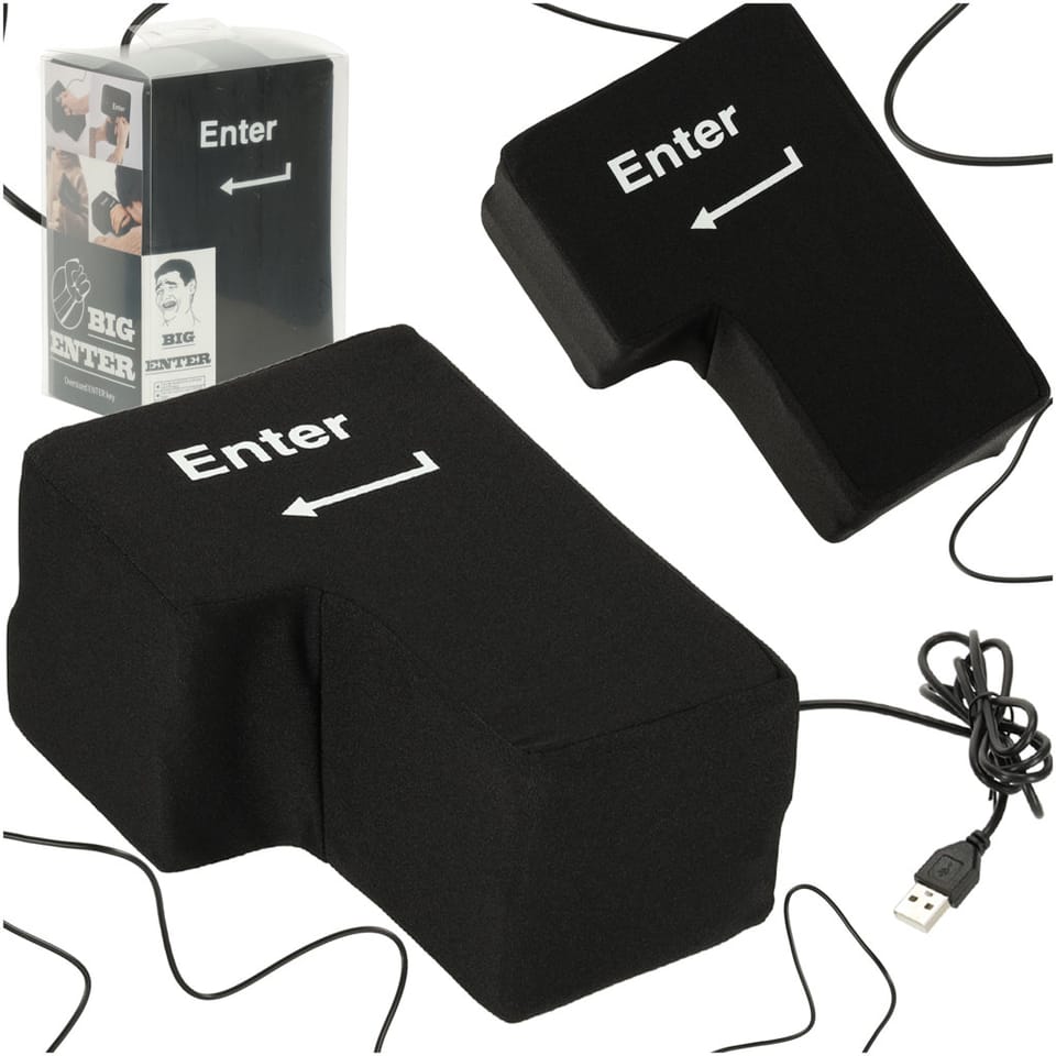 Wielki interaktywny klawisz ENTER do wciskania i uderzania za każdym razem, gdy praca lub granie przed komputerem wywołuje skrajne emocje. Działa na kabel USB, który można podłączyć do komputera lub laptopa. Klawisz reaguje na wciskanie w taki sam sposób jak klasyczny ENTER na klawiaturze.