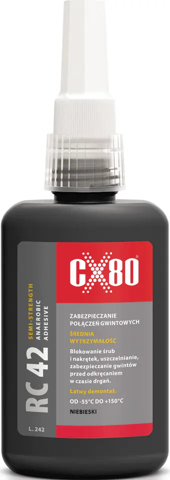 Klej anaerobowy do zabezpieczania metalowych połączeń gwintowych o średniej sile łączenia. Wiąże pod wpływem kontaktu z metalowymi powierzchniami, przy braku dostępu powietrza.