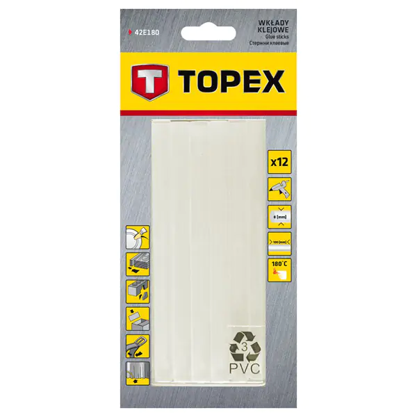Wkłady klejowe TOPEX do pistoletów klejących na gorąco. Średnica 8 mm, długość 100 mm. Pakowane w zestawie po 12 sztuk. Idealne do warsztatu majsterkowicza, jak i do profesjonalnych zastosowań, takich jak mocowanie wykładzin, produkcja mebli.