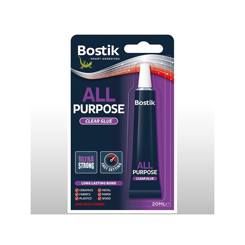 Bostik All Purpose jest silnym klejem, wodoodpornym, szybkoschnącym, przeźroczystym, który będzie się trzymał najróżniejszych przedmiotów gospodarstwa domowego.