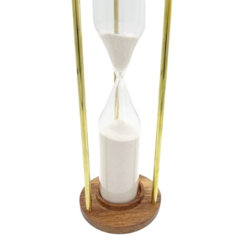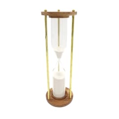 Klepsydra mosiężno - drewniana, 30min. NC2624 Wymiary: wys. 30,5cm, śr. 9,5cm Czas przesypywania: ok. 30min. Kolor piasku: biały Świetna, wysoka, klasyczna klepsydra piaskowa. Pręty mosiężne, topy drewniane. Serdecznie polecamy!