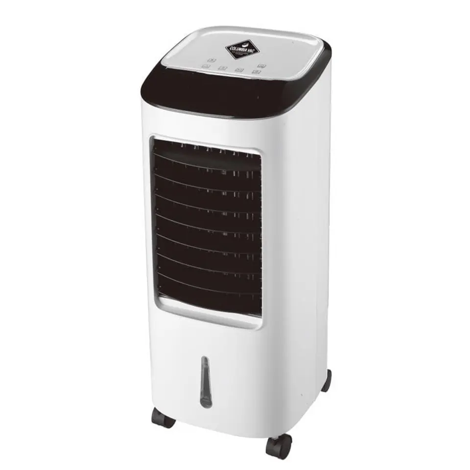 Klimator przenośny COLUMBIAVAC KC500- 3w1: CHŁODZENIE, WENTYLACJA, NAWILŻANIE- pojemność zbiornika: 7l- sterowanie: panel + pilot- panel sterowania z czytelnym wyświetlaczem- trzy tryby pracy wentylatora- timer- możliwość ustawienia czasu w zakresie od 0,5 – 7,5 godziny (postęp co 0,5 godziny)- automatyczne wyłączanie po upływie ustawionego czasu- funkcja oscylacji- filtr powietrza- wyposażony w kółka umożliwiające łatwe przemieszczanie i chowanie urządzenia w okresie, kiedy nie jest używane- moc: 65W- gwarancja 24 m-ceParametry techniczne:- przepływ powietrza: 270m3/h- wydajność przewidziana dla pomieszczenia: 20m2- pojemność zbiornika: 7l- waga netto 5 kg- napięcie zasilania: 220-240V ~ 50HzW zestawie:- klimator- pilot + baterie do pilota CR2025 x1- 2 wkłady chłodnicze- filtr powietrza