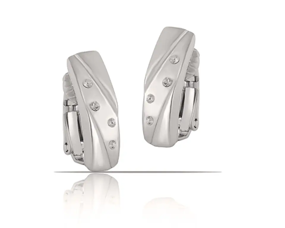 Klasyczny wzór klipsów z dodatkiem kryształków Preciosa. Długość 1,9 cm, szerokość 0,6 cm. Klipsy posrebrzane.