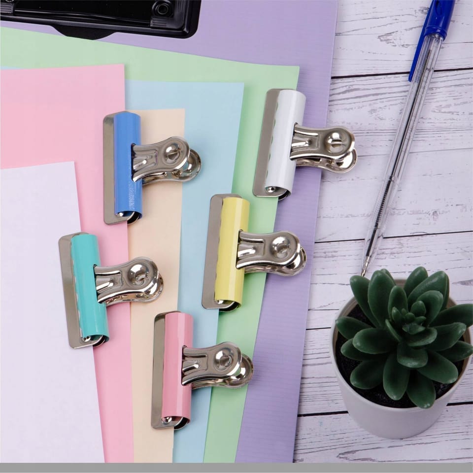 Klipy do dokumentów o szerokości 57 mm wykonane są w żywych kolorach. Bezpiecznie trzymają dokumenty i nie deformują papieru. Pakowane w kartonowe pudełko po 10 szt. Mix kolorów w opakowaniu. Spinają do 90 arkuszy papieru.- Zestaw klipów – metalowych spinaczy do papieru ze stali nierdzewnej typu Buldog. Opakowanie zawiera 10 szt. w mixie jasnych kolorów: niebieski, biały, błękitny, różowy, zielony.