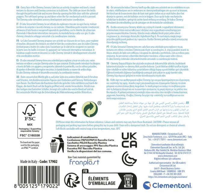- Kostka pełna wypukłych, ciekawych tekstur i funkcji pobudzających sprawność manualną dziecka oraz 4 miękkie klocki do zabawy.