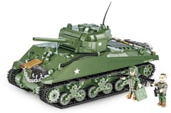 M4A3 ShermanM4 Sherman to podstawowy amerykański czołg średni z okresu II Wojny Światowej. Produkowany w latach 1942-1945 stał się najbardziej rozpoznawalnym czołgiem amerykańskim. W okresie wojny był dynamicznie rozwijany. Wyposażony był w armatę 75 mm. Amunicja oraz łatwopalny silnik sprawiły, że Shermany początkowo były łatwym celem dla cięższych czołgów niemieckich. Dopiero dopracowanie konstrukcji pozwoliło odwrócić role. Wyprodukowano łącznie około 49000 sztuk wszystkich wersji czołgu Sherman. Czołg był używany m.in. przez armię USA, Wielkiej Brytanii, Polski, Francji i ZSRR. Cieszył się opinią niezawodnego, prostego w produkcji i dobrze uzbrojonego czołgu.Klockowy Sherman został wyprodukowany w dużej skali 1:28, która umożliwia odwzorowanie większej ilości detali! Czołg posiada ruchome działo, obracającą się wieżę, otwierany właz oraz działającą trakcję gąsienicową. Wszelkie detale graficzne są wysokiej jakości nadrukami, które nie ścierają się nawet w trakcie intensywnej zabawy. Zaletą jest konstrukcja, która w wyjątkowy sposób odzwierciedla oryginalne kształty swego historycznego pierwowzoru. Na czołgu znajdują się dodatkowe akcesoria, które stanowią ładunek pojazdu i mogą być używane przez minifigurki przedstawiające załogę czołgu. Na szczególną uwagę zasługuje doskonale odwzorowana figurka dowódcy czołgu, w której można dostrzec bohatera godnego najlepszych filmów wojennych. Całość zestawu uzupełnia tabliczka z nadrukowaną nazwą czołgu.Nasze czołgi są idealne dla dojrzałych pasjonatów techniki wojskowej oraz wszystkich, niezależnie od wieku, którzy kochają historię i budowanie!Buduj historię, klocek po klocku!