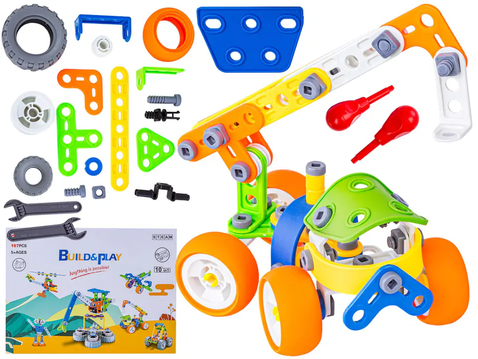 Klocki Konstrukcyjne, Elastyczne 167 El. Pojazdy Budowlane, Auto, Wyścigówka, Samolot, Robot Do Rozkręcania I Skręcania 10w1