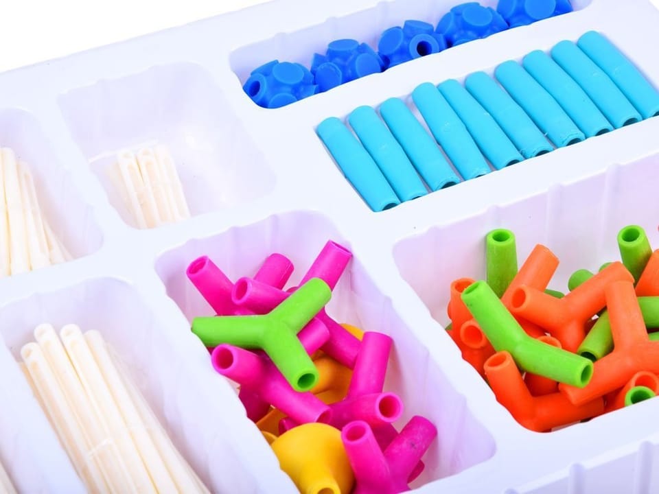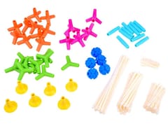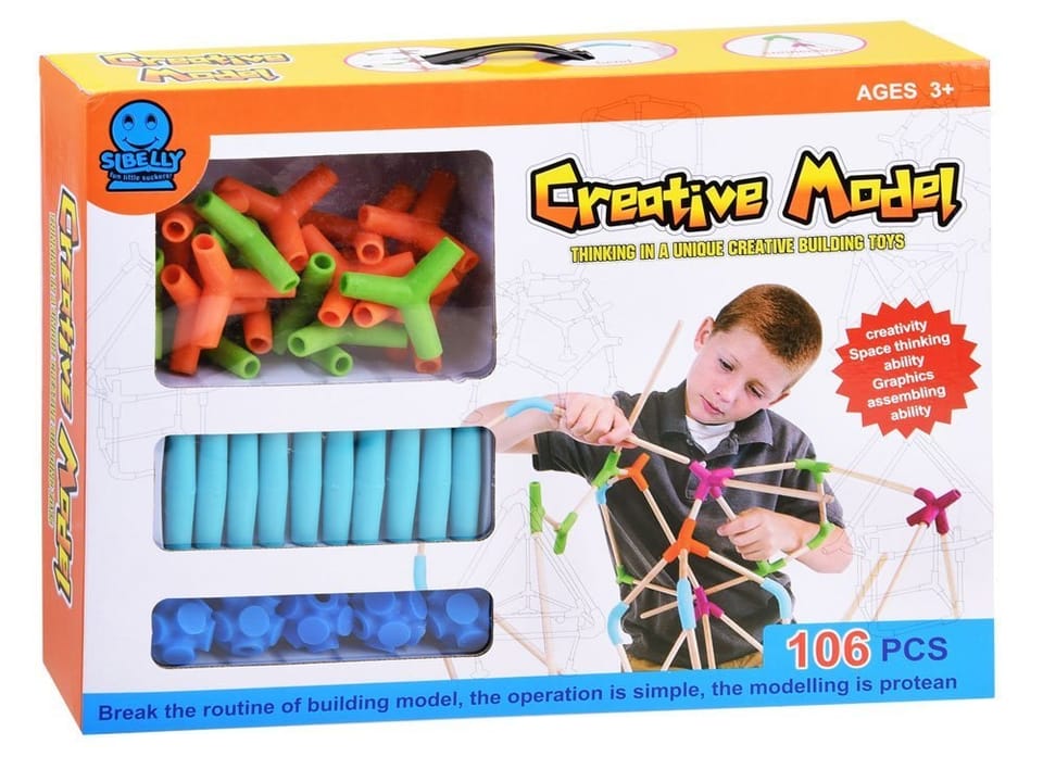 Kreatywny zestaw klocków składający się z 106 elementów przeznaczony jest do budowania przestrzennych figur, budowli idealny do szkoły zajęcia techniczne, plastyczne ect.Plastikowe patyczki o różnych długościach, gumowe łączniki oraz przyssawki pozwolą na zbudowanie naprawdę przestrzennych konstrukcji. Prosta zasada składania sprawia, że w kilka chwil można zaprojektować niemal dowolny kształt. Czy będzie to domek, statek, rakieta, samolot, auto, to każda z tych konstrukcji jest możliwa do wykonania. Poszczególne klocki rurki łączy się w większe elementy za pomocą różnego rodzaju łączników. Ich wariantowość dotyczy kąta nachylenia poszczególnych wypustek, na które nasuwa się plastikowe patyczki. Kreatywna zabawa pozwala nie tylko na rozwinięcie wielu zmysłów oraz wyobraźni, ale zapewnia dziecku zajęcie, które angażuje je na długi czas i pomaga w rozwinięciu prawdziwych pasji.Zestaw zawiera:- 12 patyczków o dł. 18,5 cm- 20 patyczków o dł. 11,5 cm- 20 patyczków o dł. 7 cm- 8 patyczków o dł. 5 cm- 10 dwu ramiennych łączników- 10 płaskich trój ramiennych łączników- 10 stożkowatych trój ramiennych łączników- 5 czteroramiennych łączników- 5 okrągłych łączników- 6 przyssawekPatyczki/klocki wykonane są z plastiku, natomiast łączniki z gumy, dzięki czemu zabawa w kreatywne układanie będzie jeszcze bardziej wszechstronna.Zestaw kreatywnych klocków przeznaczony jest dla dzieci lubiących bawić się w kreatywne układanie.Sklep Jokomisiada oferuje szereg edukacyjnych klocków, magnetycznych, drewnianych, plastikowych piankowych.Klocki zapakowane są w efektowne opakowanie, dzięki temu świetnie sprawdzą się jako prezent.