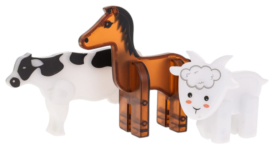 - 42 klocki w różnych kolorach i kształtach, - krówka, - baranek, - konik, - obrazkowa instrukcja,