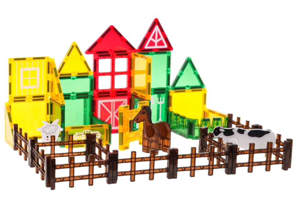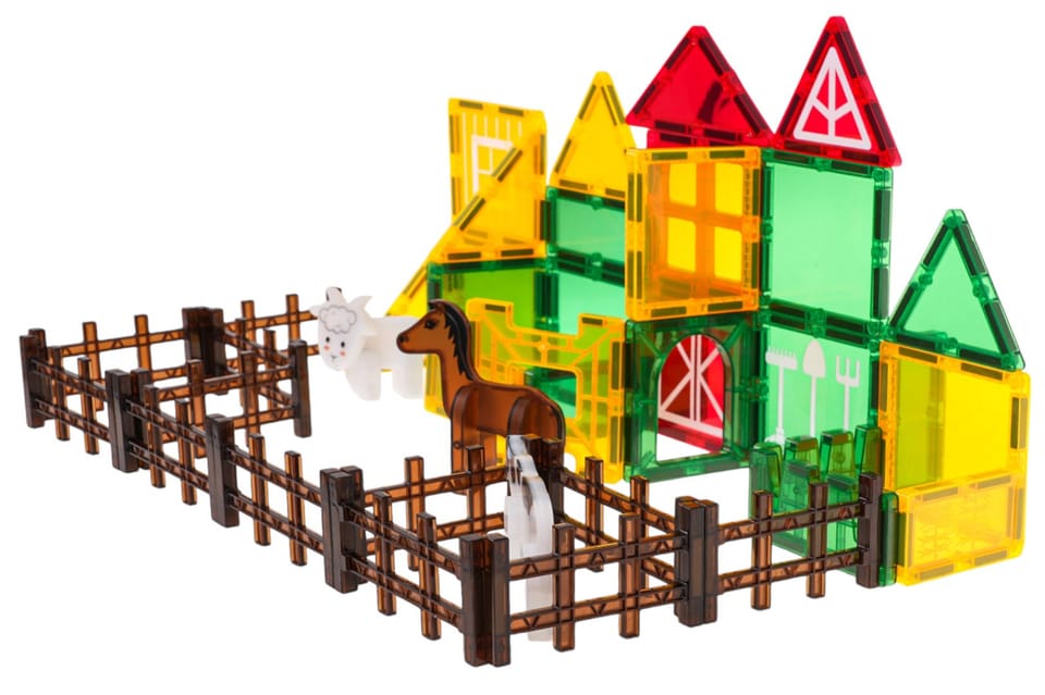 Wymiary - klocki magnetyczne kwadraty ok. 7,5 cm x 7,5 cm, - klocki magnetyczne trójkątne ok. 9,8 cm x 7,2 cm x 7,2 cm oraz 7 cm x 7 cm x 7 cm, - klocki magnetyczne prostokątne ok. 7,5 cm x 3,8 cm, - klocki z płotkiem ok. 9 cm x 4,5 cm, - figurka krówki ok. 9,5 cm x 5,3 cm x 1,5 cm, - figurka konika ok. 8,5 cm x 8,5 cm x 3 cm, - figurka baranka ok.6 cm x 5,5 cm x 4,5 cm, - opakowanie ok. 38,5 cm x 30 cm x 6 cm.
