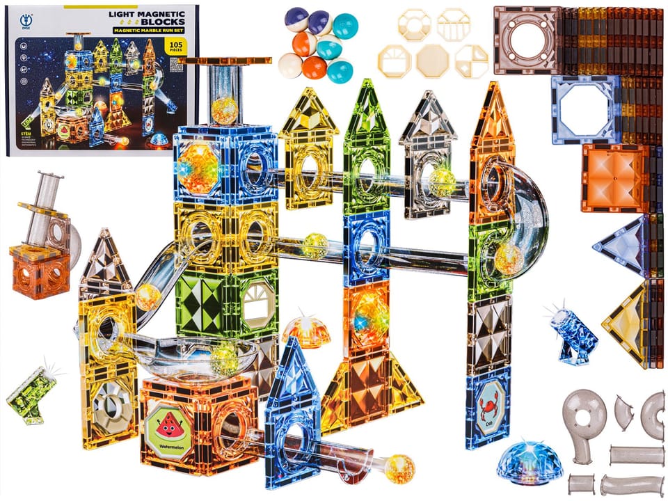 Klocki Magnetyczne Konstrukcyjne TOR KULKOWY Świecące Elementy 142 El. Kulodrom