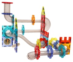 Zestaw kolorowych klocków magnetycznych dla dzieci od 3-go roku życia. Zestaw składa się z 176 elementów i pozwala na zbudowanie toru dla kulek o dowolnym układzie. Niektóre elementy zestawu zasilane są bateriami, a po włączeniu ich rozświetlają tor pulsującymi światłami, a zabawa robi się ciekawsza. Światełka pulsują w 3 trybach: szybkim, średnio szybkim i wolnym, można wybrać, który tryb będzie dla dziecka odpowiedni. Dodatkowo kilka kulek po potrząśnięciu mruga światełkami. W zestawie mamy też kilka kolorowych kapsuł, które świecą się i zmieniają kolory oraz kilka reflektorów LED. W sumie zestaw zasilany jest bateriami typu 12 x LR1130, 6 x LR41 oraz 8 x CR1220. Wszystkie baterie znajdują się w zestawie. Klocki wykonane zostały z najlepszej jakości tworzywa, są gładkie i starannie wykonane. Łączymy je ze sobą za pomocą wbudowanych magnesów. Magnesy bardzo dobrze trzymają, zapewniając stabilność konstrukcji. W zestawie znajduje się obrazkowa instrukcja złożenia przykładowych torów.