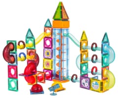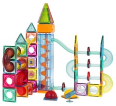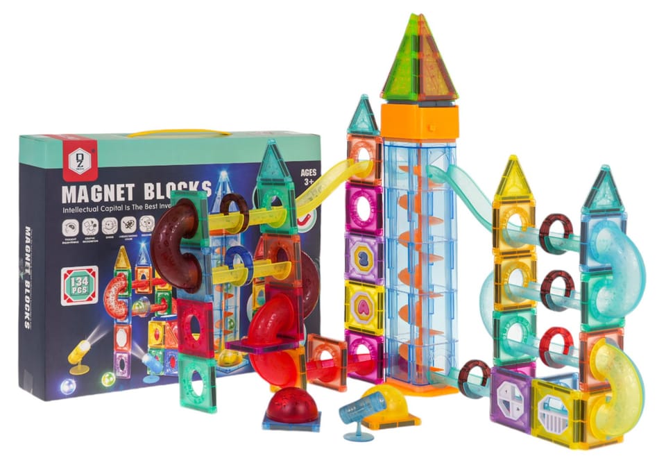 Zestaw klocków magnetycznych ze świecącymi elementami dla dzieci od 3-go roku życia. Zestaw składa się z 134 elementów, z których zbudować możemy tory przeszkód dla piłek. Konstrukcja składa się z rurek oraz klocków magnetycznych. Kolorowe, świecące piłeczki mkną po torze przeszkód, zapewniając niesamowitą zabawę. W zestawie znajdziemy również dyski z projektorem gwiazd i oświetleniem LED oraz reflektory. Niebywałą atrakcją tego zestawu jest ruchoma winda, która transportuje kulki na górę. Zabawka zasilana jest bateriami typu 12 x AG13 oraz bateriami typu 2 x AA 1,5 V (brak w zestawie).