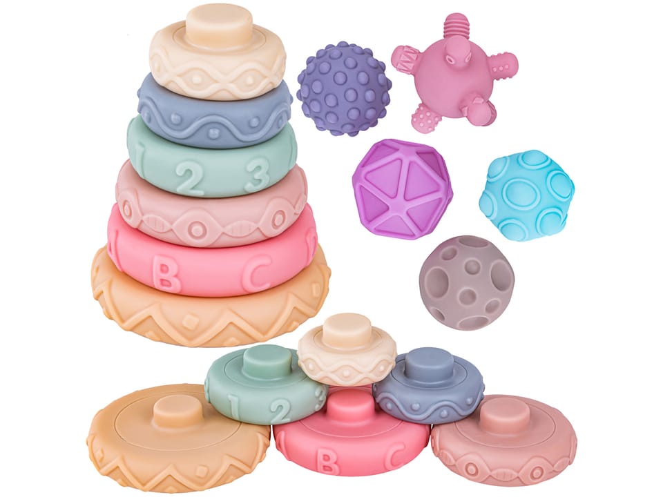 Zestaw zawiera:12 sztuk kwadratowych klocków,6 sztuk klocków okrągłych do ułożenia wieży, 5 piłek,Oryginalne opakowanie.