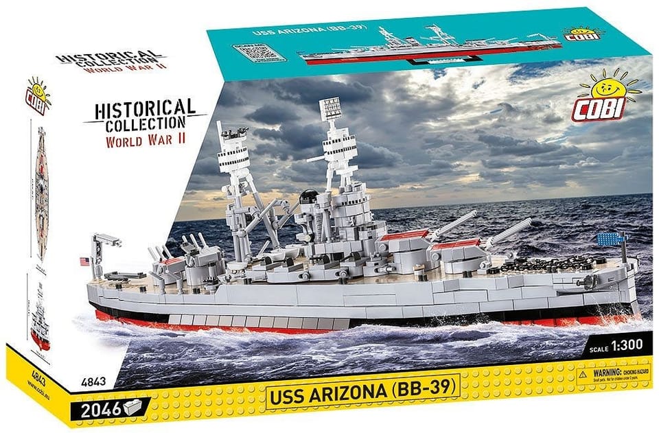 USS Arizona to pancernik zwodowany jeszcze w czasie Wielkiej Wojny. W trakcie służby okręt poddawano modernizacjom. Arizona była obecna w Pearl Harbor podczas japońskiego ataku dnia 7 grudnia 1941 roku. W czasie nalotu na pokładzie okrętu doszło do katastrofalnych w skutkach detonacji. Zginęło załogi, a okręt zatonął, stając się symbolem japońskiego ataku. Wrak pancernika nigdy nie został wydobyty. Wystające ponad powierzchnię wody elementy nadbudowy usunięto, pozostawiając jedynie barbetę trzeciej wieży artylerii głównej. W roku 1962 otwarto postawione na wraku mauzoleum USS Arizona.Słynny okręt został zaprojektowany w skali 1:300 i mierzy aż 61,5 cm długości! Ponad 2046 klocków zapewnia wiele godzin ekscytującej budowy! Czytelna oraz intuicyjna instrukcja z łatwością przeprowadzi Cię przez ten proces. Ten kolekcjonerski zestaw zawiera klockową podstawkę ekspozycyjną, do której można wpiąć tabliczkę z nazwą słynnego okrętu. Dzięki zastosowaniu najnowszych dostępnych elementów oraz zaawansowanych technik konstrukcyjnych model wiernie oddaje proporcje historycznego okrętu i zachowuje jego wszystkie istotne elementy, w tym także oryginalny, bardzo charakterystyczny kształt kadłuba i nadbudowy. Model posiada liczne ruchome części takie jak: śruby napędowe, stery, obracane wieże i lufy dział, które można podnosić i opuszczać. Zestaw jest doskonałym uzupełnieniem kolekcji historycznych okrętów COBI.