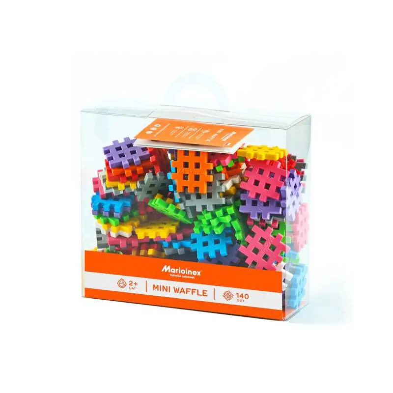Mini waffle 140 Zupełnie nowe Mini Waffle to nowatorski, miękki, przypominający w dotyku gumę materiał o znanym nam kształcie. Pomniejszony rozmiar daje znacznie większą mobilność oraz całkiem nowe możliwości. Dzięki nowej technologii produkcji, którą zastosowaliśmy klocki dają się wyginać oraz są ciche i bezpieczne w zabawie. Dzieci mogą tworzyć nowe budowle o znacznie mniejszym formacie niż dotychczasowe klocki Waffle, dzięki temu nasze pociechy nie muszą się martwić o zagospodarowanie większej przestrzeni. W zestawie znajdziesz 140 elementów. Rozmiar opakowania: 18.5 cm x 16 cm x 6 cm