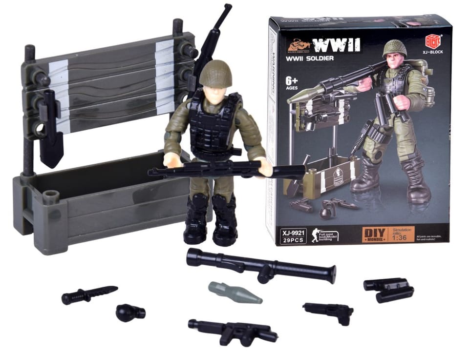 Zestaw do ułożenia modelu żołnierza z okresu II Wojny Światowej to propozycja dla każdego fana składania klocków a także miłośników militariów i historii. Gotowa figurka przyda się podczas zabaw w wojnę, do odtwarzania epickich bitew, czy jako dodatek do kolekcji czołgów, samolotów, pojazdów wojskowych.