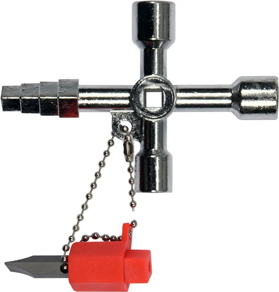 Czteroramienny klucz, przeznaczony do otwierania i zamykania zamków w szafach technicznych np. z licznikami gazu, prądu, wody, urządzeń klimatyzacji, wentylacji itp.