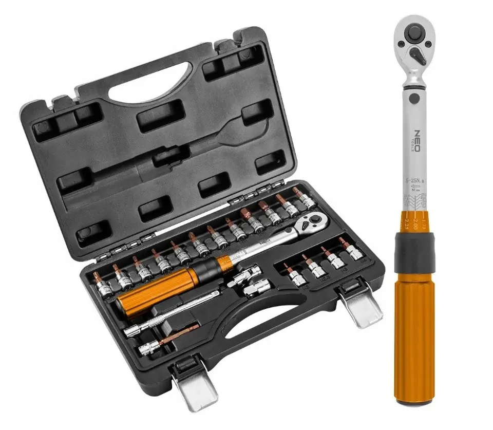 Klucz dynamometryczny dwukierunkowy NEO (nr ref. 08-821) to zestaw składający się z 21 elementów.