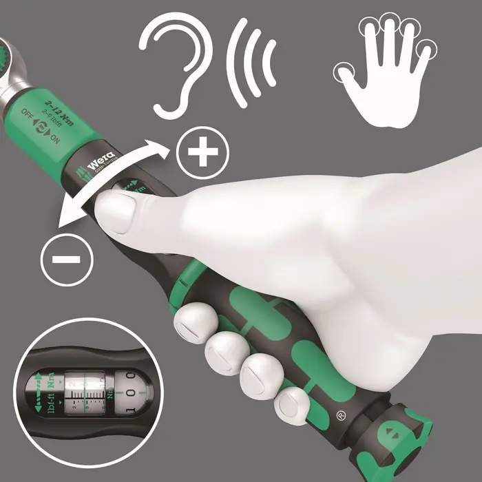 Łatwe ustawianie i zabezpieczanie wartości zadanej: słyszalne i wyczuwalne zablokowanie po osiągnięciu wartości skali ułatwia również niezawodne ustawienie żądanego momentu obrotowego.