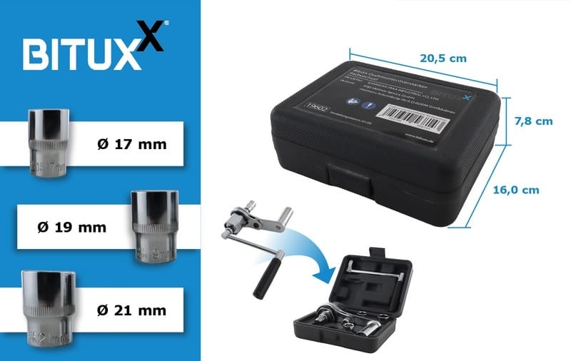 Profesjonalny klucz dynamometryczny Bituxx z zakresem od 28 do 210 Nm, wyposażony w 3 nasadki (17 mm, 19 mm, 21 mm). Całość zapakowana w solidną walizkę transportową. Idealny do pracy w warsztacie, garażu lub dla majsterkowiczów.