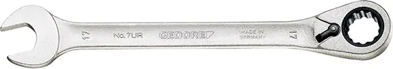 Wykonanie: ze stali wanadowej 31CrV3 GEDORE. Chromowany matowo, z wygodnym w użyciu i mocnym trzonkiem drążonym. Blokada i zapadka manganofosforyzowane. Dzięki małej liczbie zębów grzechotka jest bardzo wytrzymała, natomiast specjalna geometria zapadek zapewnia bardzo mały kąt pracy. Kąt pracy 7° do rozmiaru klucza 15 mm, 6° do rozmiaru klucza 27 mm i 5° do rozmiaru klucza 36 mm. Główka grzechotkowa jest wygięta o 13°. Odchylenie szczęk 15°, szlifowany dokładnie na rozmiar klucza. Momenty obrotowe przewyższają wymagania DIN 3113.