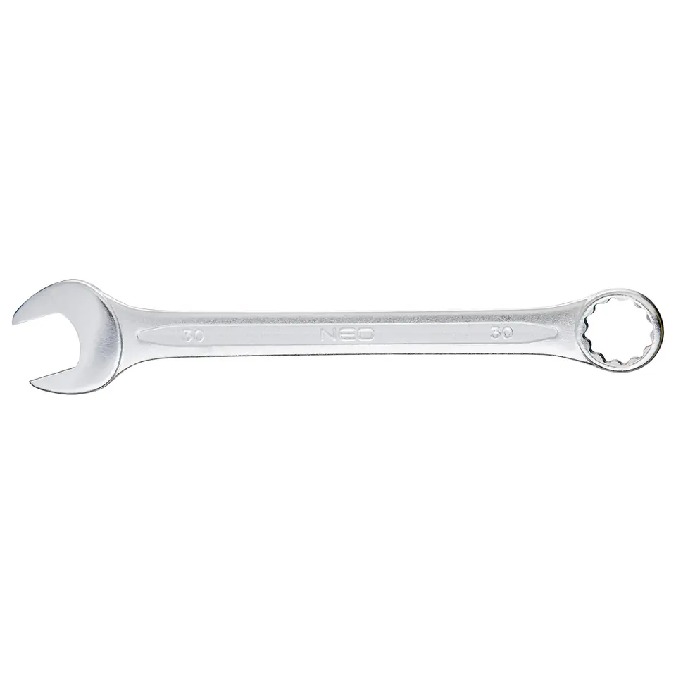 Klucz płasko-oczkowy 30 x 340 mm, stal CrV, DIN3113, przetłoczenie, wykończenie satynowe, polerowana główka odgięta pod kątem 15°, certyfikat TÜV M+T, 25 lat gwarancji