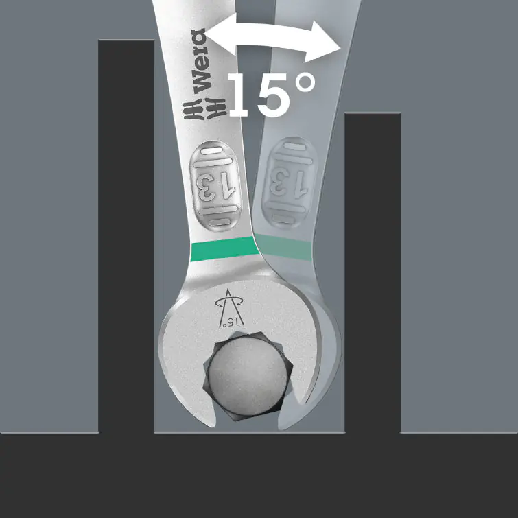 Smukła, a jednocześnie wytrzymała strona oczkowa klucza jest odchylona pod kątem 15° w stosunku do osi narzędzia.