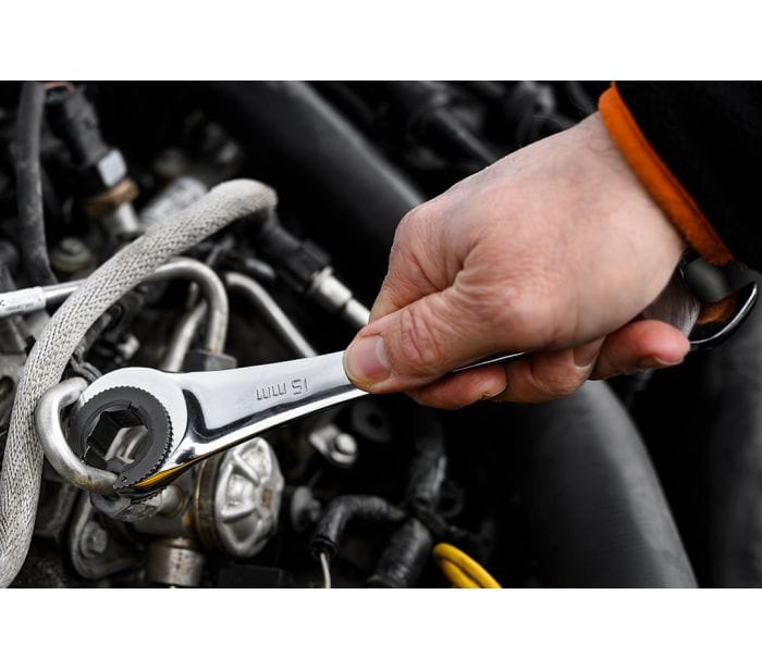 Klucz płasko-oczkowy, rozcięty z grzechotką 72 zęby, 15 mm, stal CrV