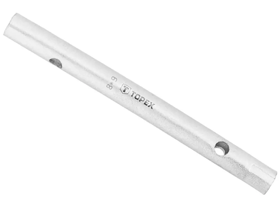Klucz rurowy TOPEX z nasadkami sześciokątnymi 8 x 9 mm. Jego napędem może być pokrętło przełożone przez otwory znajdujące się w korpusie. Sześciokątny przekrój końcówek sprawia, że możliwe jest kręcenie kluczem rurowym poprzez klucz płaski. Marka TOPEX skierowana jest do majsterkowiczów.