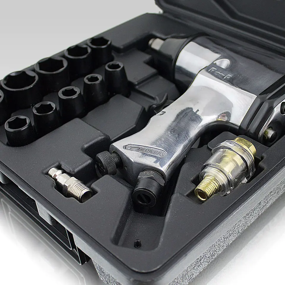 Klucz pneumatyczny jest to urządzenie przeznaczone dla domowego majsterkowicza, jak i fachowca. Poręczne, lekkie, urządzenie pneumatyczne ma szerokie zastosowanie w montażu i demontażu wszystkich połączeń śrubowych. Nasadki wykonane zostały z specjalnej odmiany stali (CrV) chromowo-wanadowa. Chrom i wanad gwarantuje odporność na korozję, utlenianie, ścieranie i dużą wytrzymałość materiału. W zestawie dołączona jest przedłużka umożliwiająca dostanie się do oddalonych połączeń śrubowych. Klucz pneumatyczny posiada funkcje obrotów w obie strony prawo/lewo.