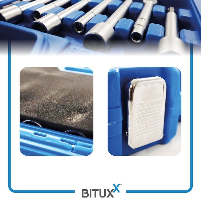 18-elementowy zestaw narzędzi do amortyzatorów BITUXX to idealne rozwiązanie do bezpiecznego i profesjonalnego montażu oraz demontażu amortyzatorów w samochodach osobowych i dostawczych.