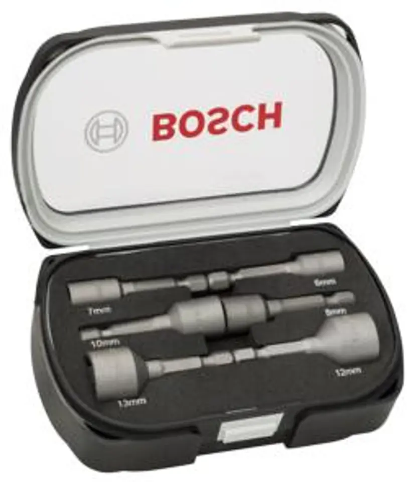 Zestaw 6 kluczy nasadowych marki Bosch w rozmiarach od 6mm do 13mm w pudełku.