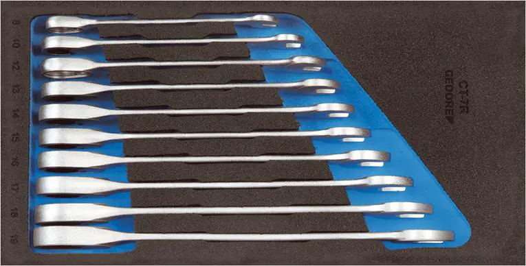 10 kluczy płaskich z grzechotką pierścieniową 8; 10; 12; 13; 14; 15; 16; 17; 18; 19 mm Zawartość zestawu:
