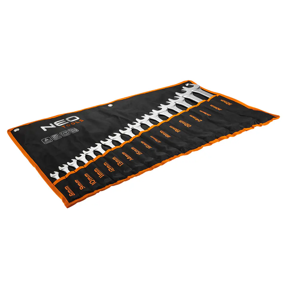Klucze płasko-oczkowe 8-32 mm, zestaw 17 szt., 8, 9, 10, 11, 12, 13, 14, 15, 16, 17, 18, 19, 22, 24, 27, 30, 32 mm, stal CrV DIN3113, certyfikat TÜV M+T, 25 lat gwarancji