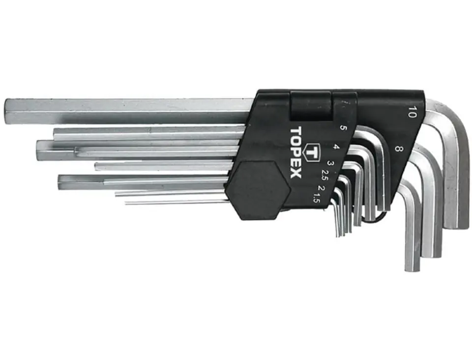 Klucze sześciokątne długie TOPEX (nr ref. 35D956) w rozmiarach 1.5-10 mm. Wykonane z wytrzymałej stali chromowo-wanadowej, zapewniającej długą żywotność produktu. Praktyczne opakowanie z tworzywa sztucznego, z oznaczoną przegródką na każdy klucz, ułatwia ich przechowywanie. Marka TOPEX skierowana jest do majsterkowiczów.
