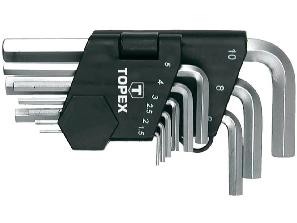 Klucze sześciokątne krótkie TOPEX (nr ref. 35D955) w rozmiarach 1.5-10 mm. Wykonane z wytrzymałej stali chromowo-wanadowej, zapewniającej długą żywotność produktu. Praktyczne opakowanie z tworzywa sztucznego, z oznaczoną przegródką na każdy klucz, ułatwia ich przechowywanie. Marka TOPEX skierowana jest do majsterkowiczów.
