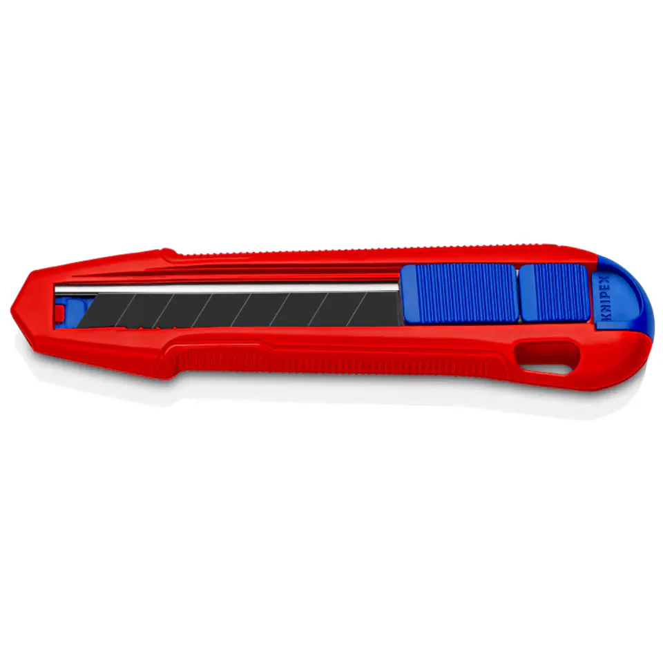 - Poręczny: długość 165 mm, masa ok. 111 g Nóż dostarczany z wysokiej jakości odłamywanymi ostrzami, dwa ostrza wymienne w uchwycie, wymiana bez użycia narzędzi Pasuje do standardowych kształtów ostrzy 18 mm: gładkich, zakrzywionych, z hakami Dzięki smukłemu kształtowi i wielu strefom chwytu wygodnie leży w dłoni: pewny chwyt bez ryzyka wyślizgnięcia się narzędzia, komfortowa obsługa Płaskie, ergonomiczne suwaki oddzielnie dla ostrza i szyny stabilizującej, eliminacja ryzyka przypadkowego uruchomienia suwaka Niezawodny uchwyt ostrza: pewne mocowanie ostrza dzięki trzpieniowi ze stali hartowanej Zamknięta tylna część uchwytu zapobiega niezamierzonemu wysunięciu suwaka i ostrza Uchwyt mocujący do systemu zabezpieczającego narzędzia przedupadkiem KNIPEX Tethered Tools*