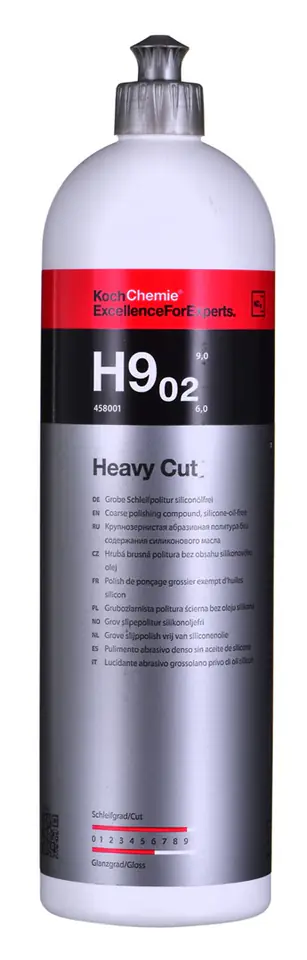 Koch Chemie H9.02 Heavy Cut – to innowacyjna pasta polerska do polerowania mocno wyblakłych lakierów, usuwania głębokich zarysowań i skutecznego usuwania tzw. mgły lakierniczej oraz zgładów i zmatowień po papierze o gradacji P1200. Dzięki niezwykle jednorodnemu ziarnu materiału ściernego zapewnia wysoki poziom cięcia i stopień połysku. Charakteryzuje się długim czasem wypracowania i niskim poziomem pylenia. Może być stosowana do wszystkich rodzajów lakieru (miękki i odpornych na zarysowania).