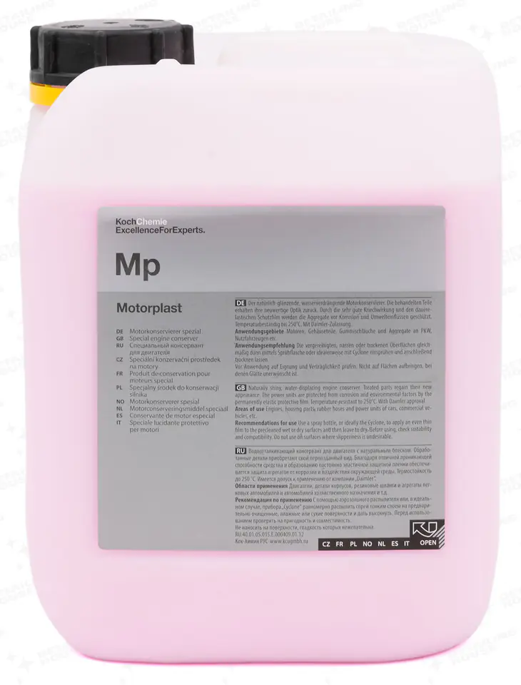 Koch Chemie Motorplast – to produkt przeznaczony do konserwacji elementów komory silnika - plastików, węży gumowych i silników w samochodach osobowych, pojazdach użytkowych itp. Z łatwością wypiera wodę, pozostawia wykończenie o naturalnym połysku i posiada przyjemny owocowy zapach. Zabezpieczone elementy odzyskują swój naturalny wygląd. Całkowicie wysycha i zapobiega przywieraniu zanieczyszczeń. Dzięki dobrej zdolności do penetracji i trwale elastycznej warstwie ochronnej urządzenia są zabezpieczone przed korozją i wpływami środowiska. Może być stosowany na suchych i mokrych powierzchniach. Odporny na temperaturę do 250°C. Posiada dopuszczenie firmy Daimler.