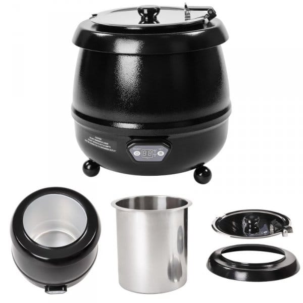 Nazwa producenta: RCST-9400D Profesjonalny kociołek gastronomiczny służący do długotrwałego utrzymywania potraw w cieple. Garnek doskonale sprawdzi się do takich potraw jak zupy, gulasze, sosy, danie jednogarnkowe, kompoty itp.Woda wykorzystywana jest w nim jako nośnik ciepła więc ciepło jest w optymalny sposób przenoszone na potrawy, które nie mogą się przypalić, ponieważ kąpiel wodna nigdy nie osiągnie temperatury wrzenia wody.Cyfrowy panel sterowania zapewnia łatwą i intuicyjną obsługę a temperaturę wody można płynnie regulować w zakresie od 30 – 95deg;C. Wyświetlacz LCD prezentuje aktualną oraz nastawioną temperaturę a wydajny i precyzyjny termostat czuwa utrzymywaniem pożądanej temperatury. Cechy i funkcje:- zabudowana grzałka ułatwia utrzymanie czystości i ogranicza osadzanie się kamienia- wkład wykonany w całości ze stali nierdzewnej- wyjmowany stalowy pojemnik na potrawy który można myć w zmywarce- zakres temperatury do 95deg;C- antypoślizgowe nóżki- pokrywka posiada otwór na łyżkę wazową- odporna stalowa obudowa pokryta emaliąParametry techniczne: