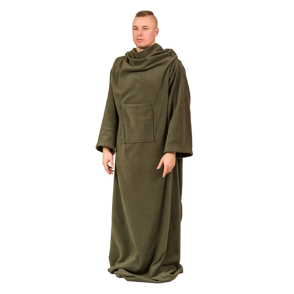 Koc z rękawami i wygodną kieszenią Chłodne jesienno-zimowe wieczory spędzane w domu mogą być bardzo przyjemne pod warunkiem, że zaopatrzysz się w miękki i cieplutki kocyko-szlafrok! Jest to połączenie ciepłego koca z miękkim szlafrokiem, które sprawi, że nie zechcesz ruszyć się z kanapy przez cały wieczór! To wyjątkowe ubranie ma wygodną kieszeń, w której zmieści się pilot do telewizora i kilka innych przydatnych podczas wypoczynku drobiazgów. Do domu i na zewnątrz Nie miej żadnych wyrzutów sumienia – chwila błogiego lenistwa w przyjemnym cieple należy się każdemu! Kocyko-szlafrok sprawdzi się świetnie podczas długich podróży czy na kempingu. Będzie także prawdziwym wybawieniem dla osób cierpiących na przeziębienie lub grypę. Polecamy jako prezent dla osób ciepłolubnych w każdym wieku.