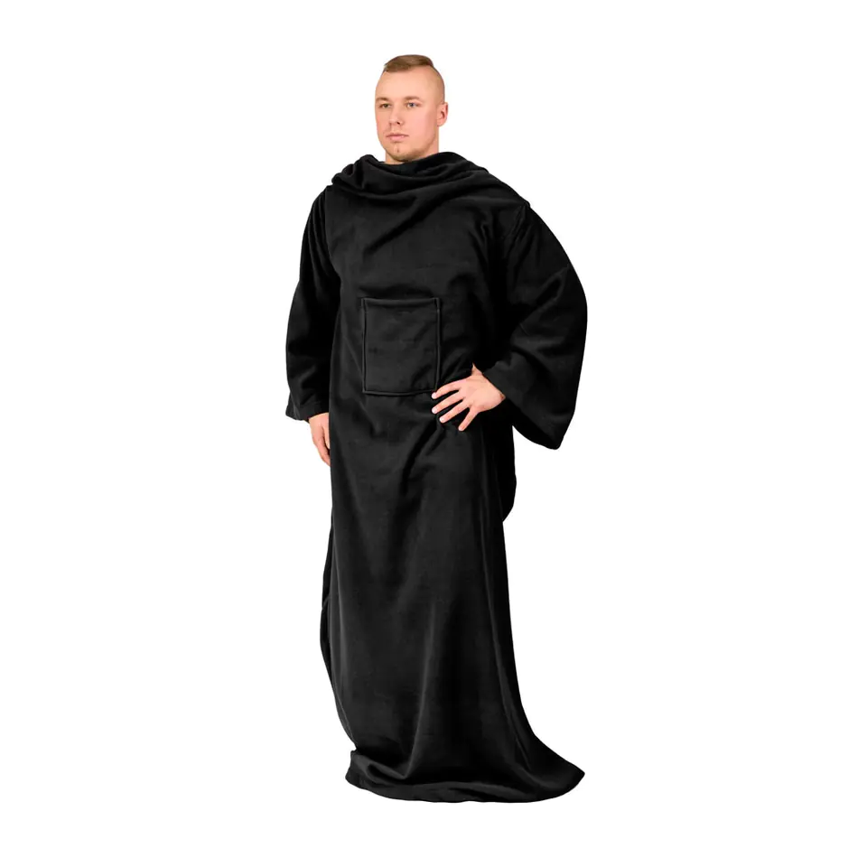 Koc z rękawami i wygodną kieszenią Chłodne jesienno-zimowe wieczory spędzane w domu mogą być bardzo przyjemne pod warunkiem, że zaopatrzysz się w miękki i cieplutki kocyko-szlafrok! Jest to połączenie ciepłego koca z miękkim szlafrokiem, które sprawi, że nie zechcesz ruszyć się z kanapy przez cały wieczór! To wyjątkowe ubranie ma wygodną kieszeń, w której zmieści się pilot do telewizora i kilka innych przydatnych podczas wypoczynku drobiazgów. Do domu i na zewnątrz Nie miej żadnych wyrzutów sumienia – chwila błogiego lenistwa w przyjemnym cieple należy się każdemu! Kocyko-szlafrok sprawdzi się świetnie podczas długich podróży czy na kempingu. Będzie także prawdziwym wybawieniem dla osób cierpiących na przeziębienie lub grypę. Polecamy jako prezent dla osób ciepłolubnych w każdym wieku.