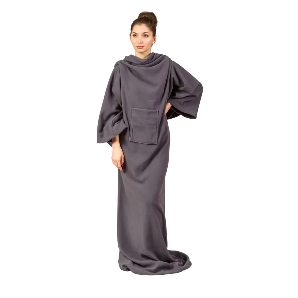 Koc z rękawami i wygodną kieszenią Chłodne jesienno-zimowe wieczory spędzane w domu mogą być bardzo przyjemne pod warunkiem, że zaopatrzysz się w miękki i cieplutki kocyko-szlafrok! Jest to połączenie ciepłego koca z miękkim szlafrokiem, które sprawi, że nie zechcesz ruszyć się z kanapy przez cały wieczór! To wyjątkowe ubranie ma wygodną kieszeń, w której zmieści się pilot do telewizora i kilka innych przydatnych podczas wypoczynku drobiazgów. Do domu i na zewnątrz Nie miej żadnych wyrzutów sumienia – chwila błogiego lenistwa w przyjemnym cieple należy się każdemu! Kocyko-szlafrok sprawdzi się świetnie podczas długich podróży czy na kempingu. Będzie także prawdziwym wybawieniem dla osób cierpiących na przeziębienie lub grypę. Polecamy jako prezent dla osób ciepłolubnych w każdym wieku.